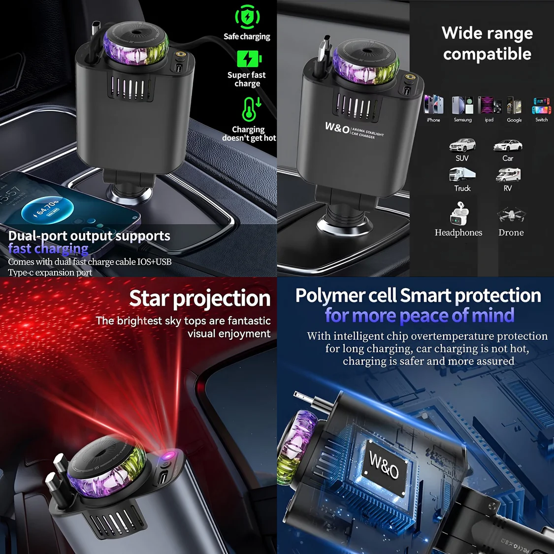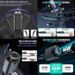 Combines a car charger, built-in air freshener, dual USB ports, LED ambient light, and a retractable cable for all-in-one convenience.